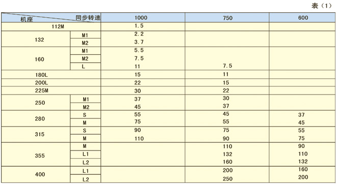 基準工作制(S340%)時的額定輸出功率和同步轉速見表1(籠型電動機制造粗線框內的規格)
